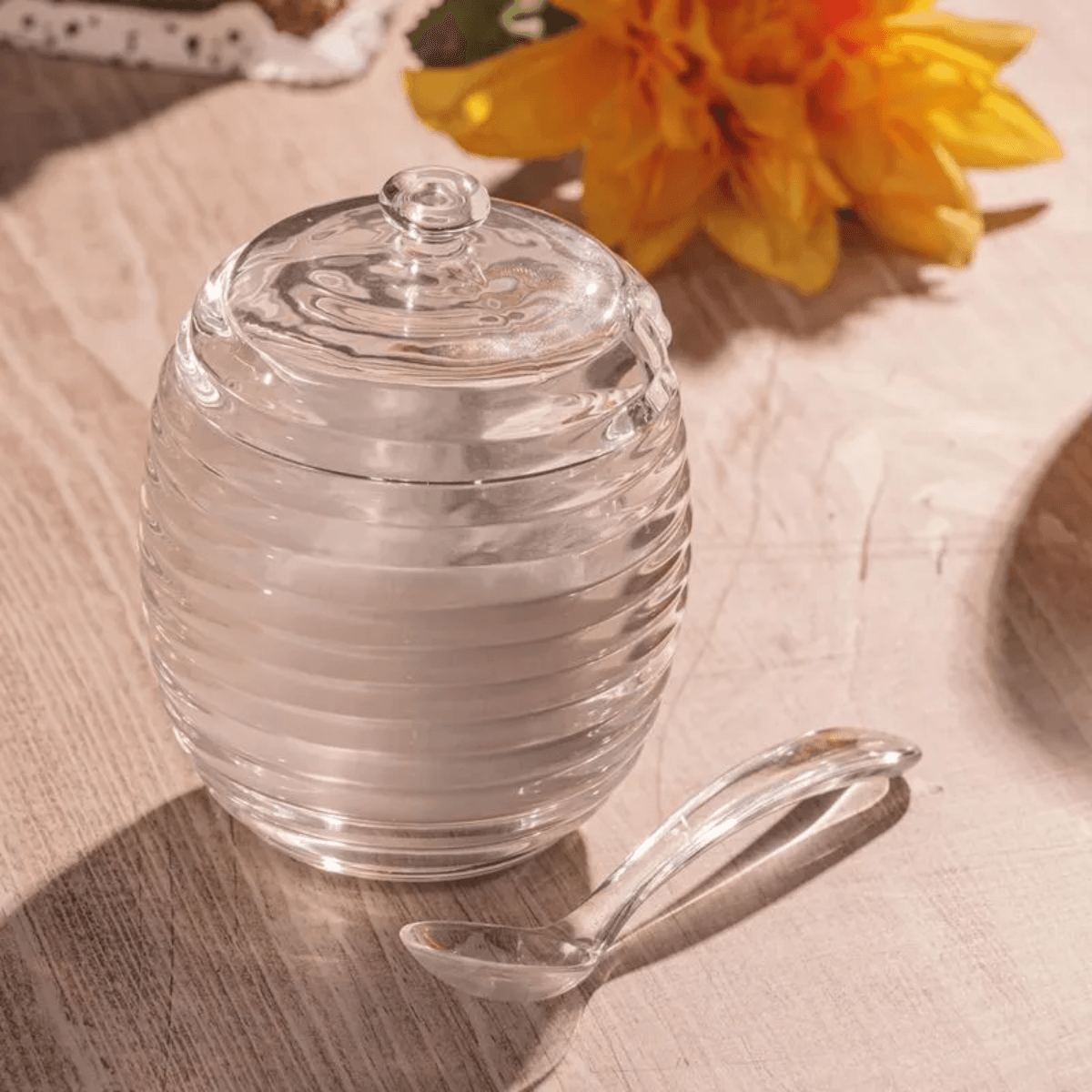 Detalhes funcionais: Acompanha colher de acrílico para uso prático e tampa com design colméia que protege e decora