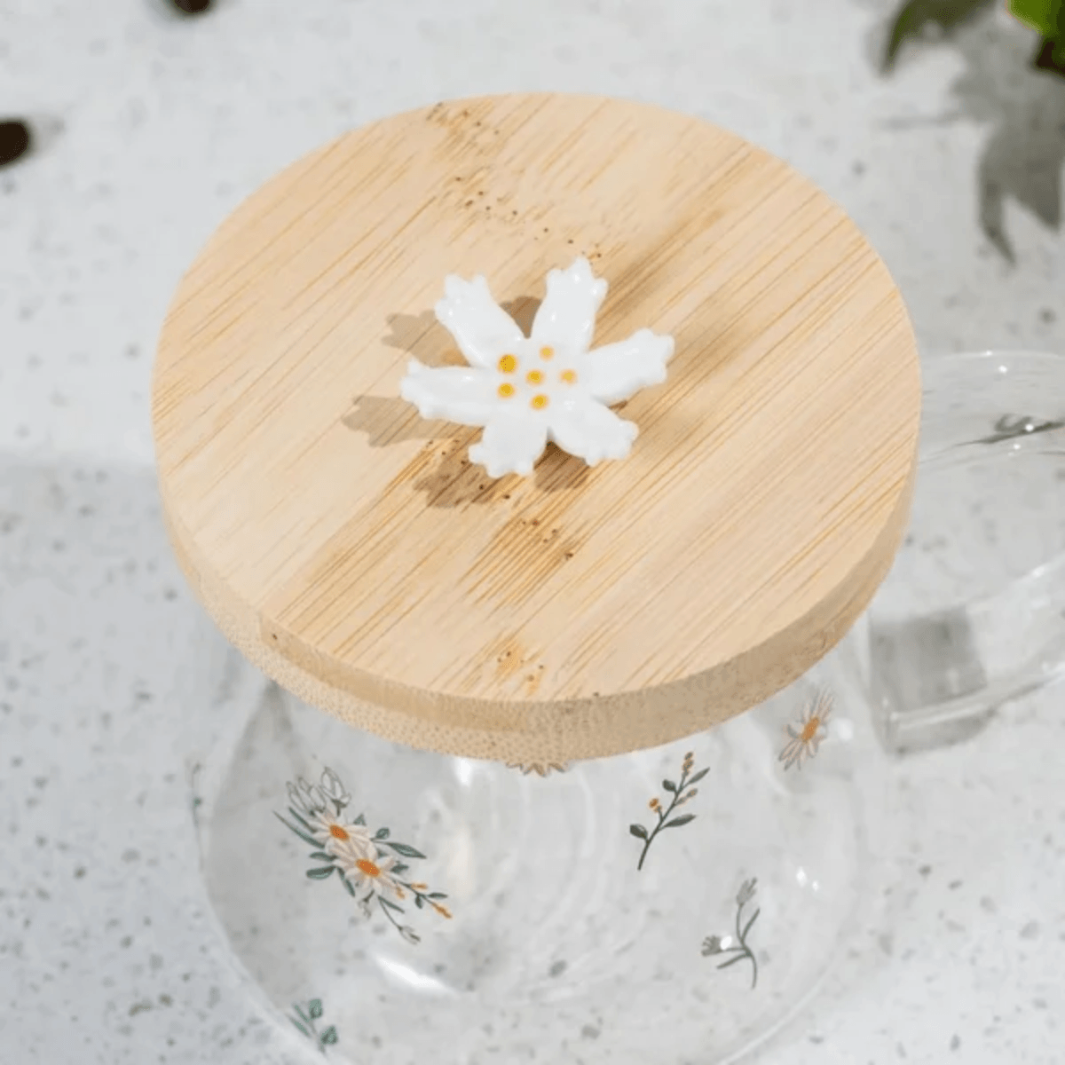 Essa caneca é feita de vidro borossilicato de alta qualidade, que oferece resistência ao calor e durabilidade superior. Seu design transparente proporciona uma experiência visual agradável, enquanto o pires de bambu traz um toque natural, elegante e sustentável ao conjunto. A estampa Daisy adiciona charme e sofisticação, tornando esta caneca ideal para o uso diário ou para ocasiões especiais.
