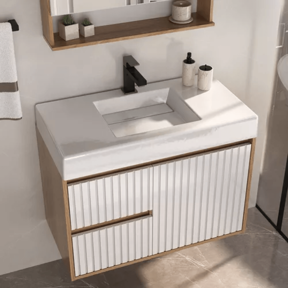 O Conjunto Clarice da Fabribam destaca-se pelo design elegante e contemporâneo, ideal para transformar o banheiro com sofisticação e funcionalidade. Com acabamento amadeirado na cor Catedral e frente fresada branca com efeito ripado, o móvel traz requinte e modernidade ao ambiente.