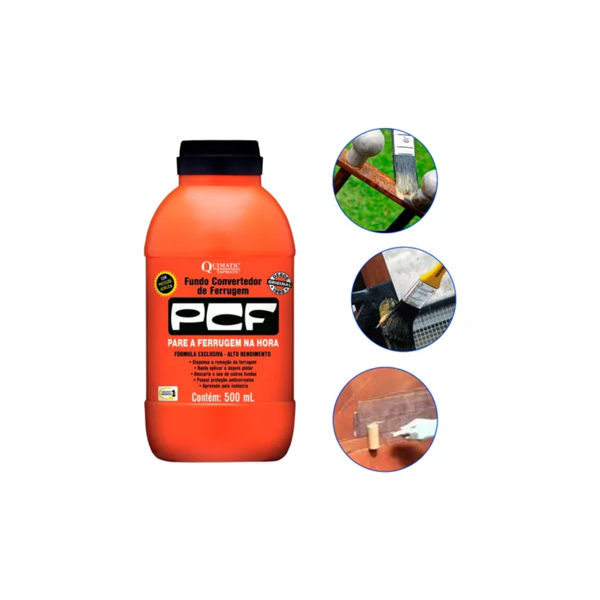 Utilizado em quaisquer superfícies com ferrugem para converte-lá em um fundo para receber tinta de acabamento compatível com o P.C.F. Entre os tipos de tinta mais utilizados, recomendamos o uso de esmalte sintético, tinta epóxi e tinta PU. Entre outras aplicações, o P.C.F. pode ser utilizado em estruturas metálicas, portões, escadas e cercas.