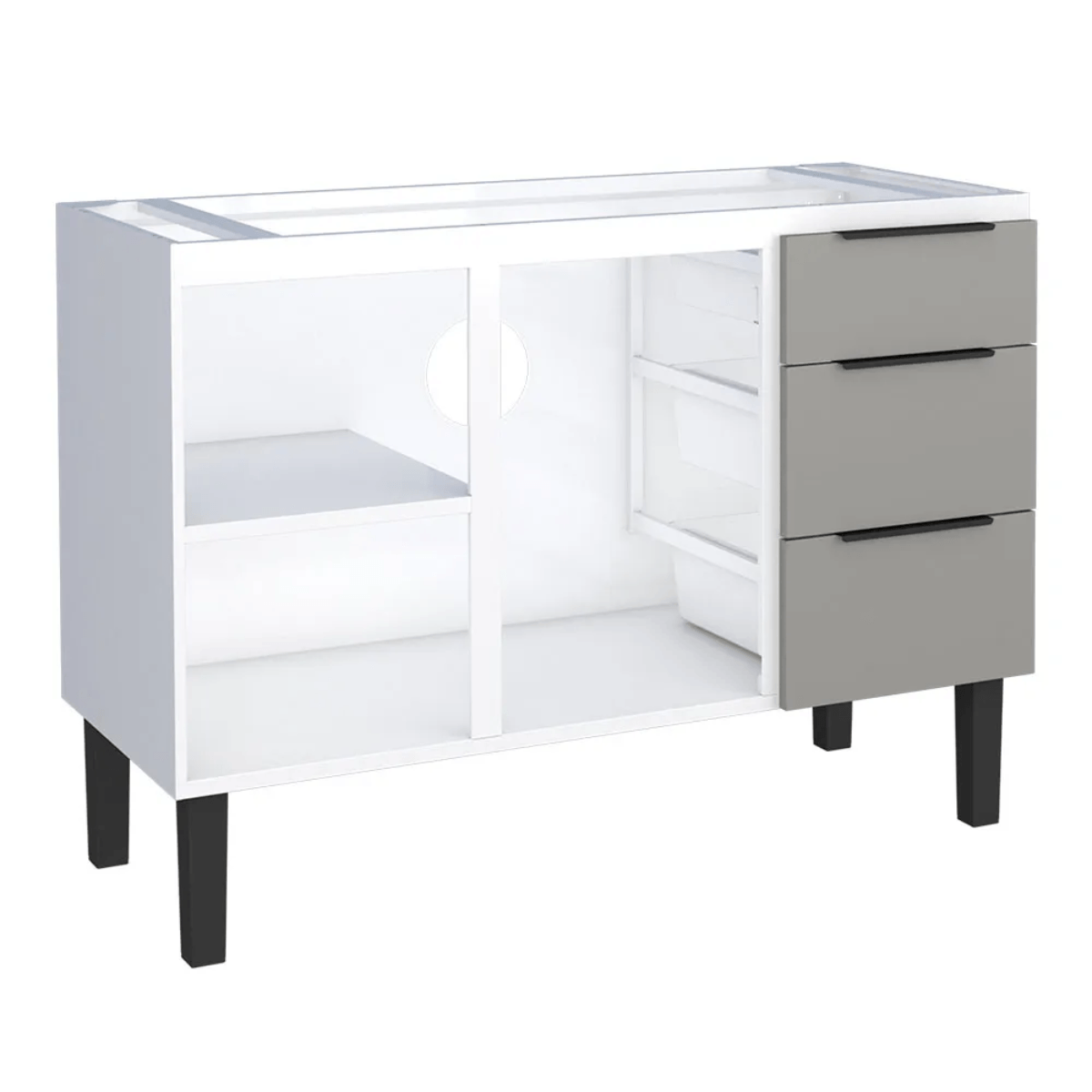 O gabinete também oferece fundo completo com passagem para sifão e gavetas com divisor de talheres, proporcionando praticidade e organização.