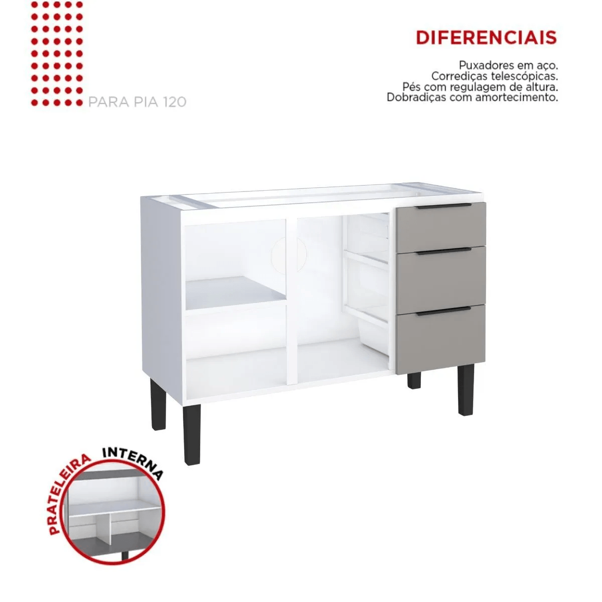 Este modelo possui três portas e três gavetas, além de prateleiras internas que facilitam a organização dos utensílios. Conta com puxadores em aço eletrogalvanizado que complementam o visual contemporâneo, pés em polipropileno virgem com regulagem de altura para estabilidade em diferentes superfícies e acabamento interno nas portas, garantindo um produto de alta qualidade.