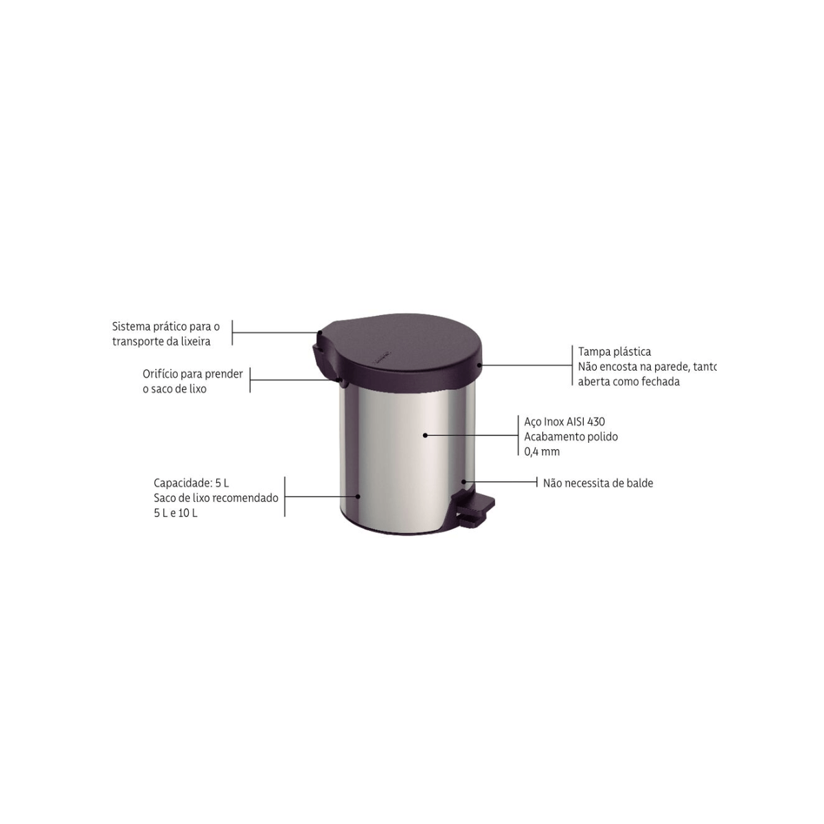 Com capacidade de 5l ela não necessita de balde plástico, podendo utilizar somente o saco de lixo de 10 – 15 l que fica preso pelo orifício lateral da lixeira. Ao fechar a tampa, o saco de lixo não aparece, mantendo a estética do produto.