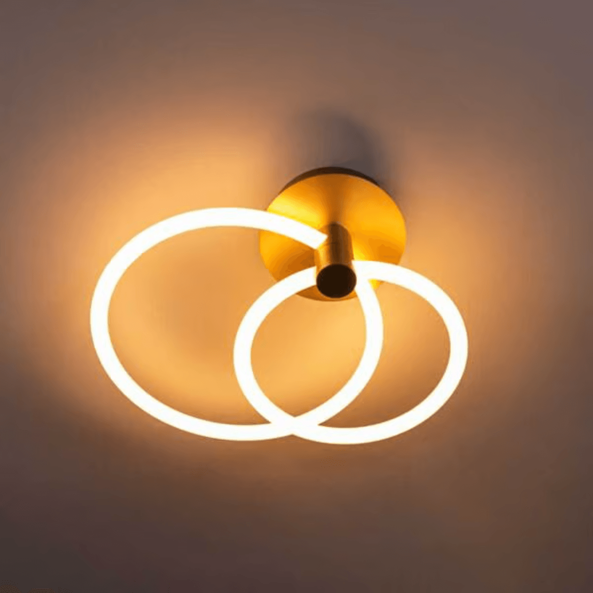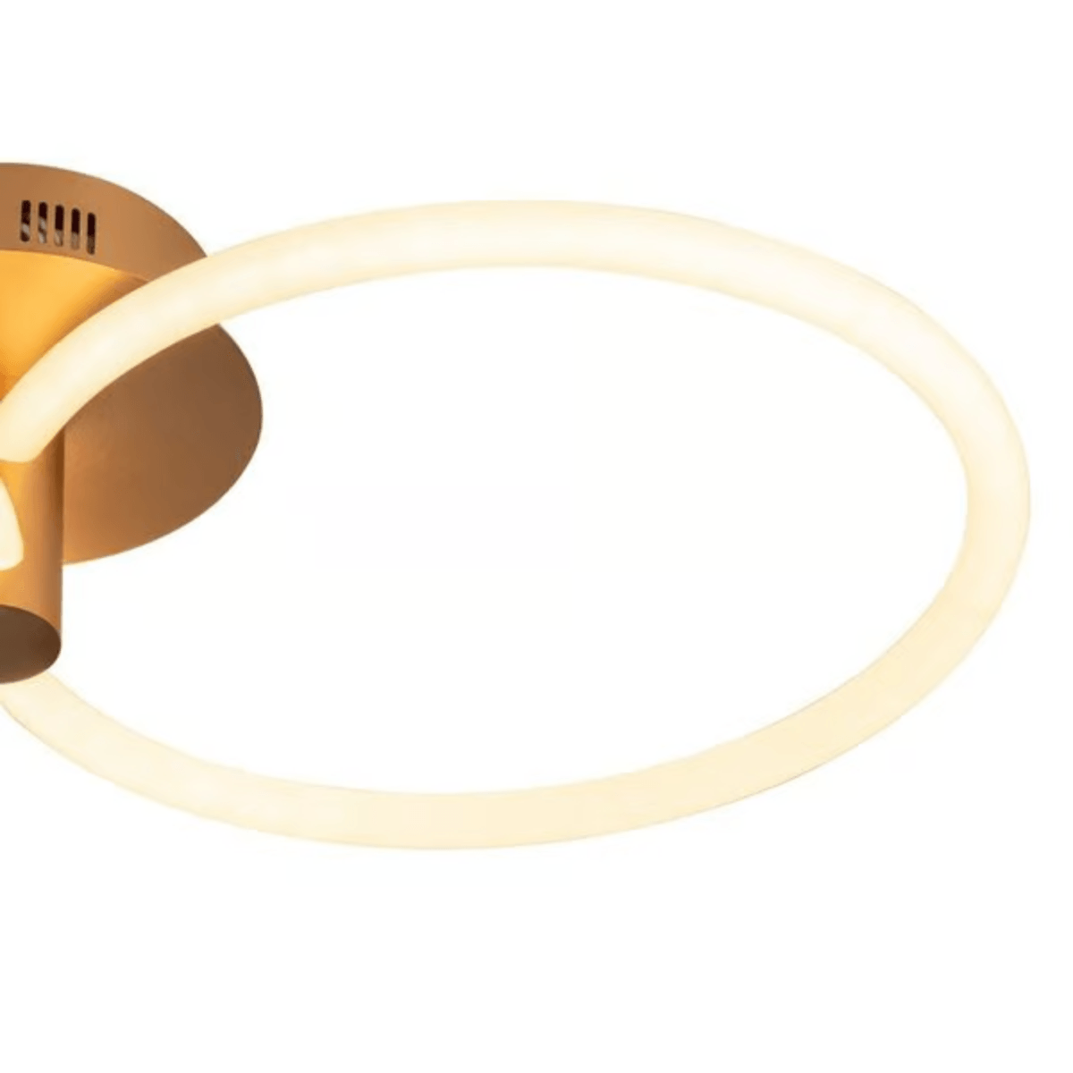 Produzido em metal na cor French Gold, ele possui dois círculos de acrílico branco, que já vem com LEDs integrados com potência total de 32,4W, branco quente 3000K e com com fluxo luminoso de 1620LM.