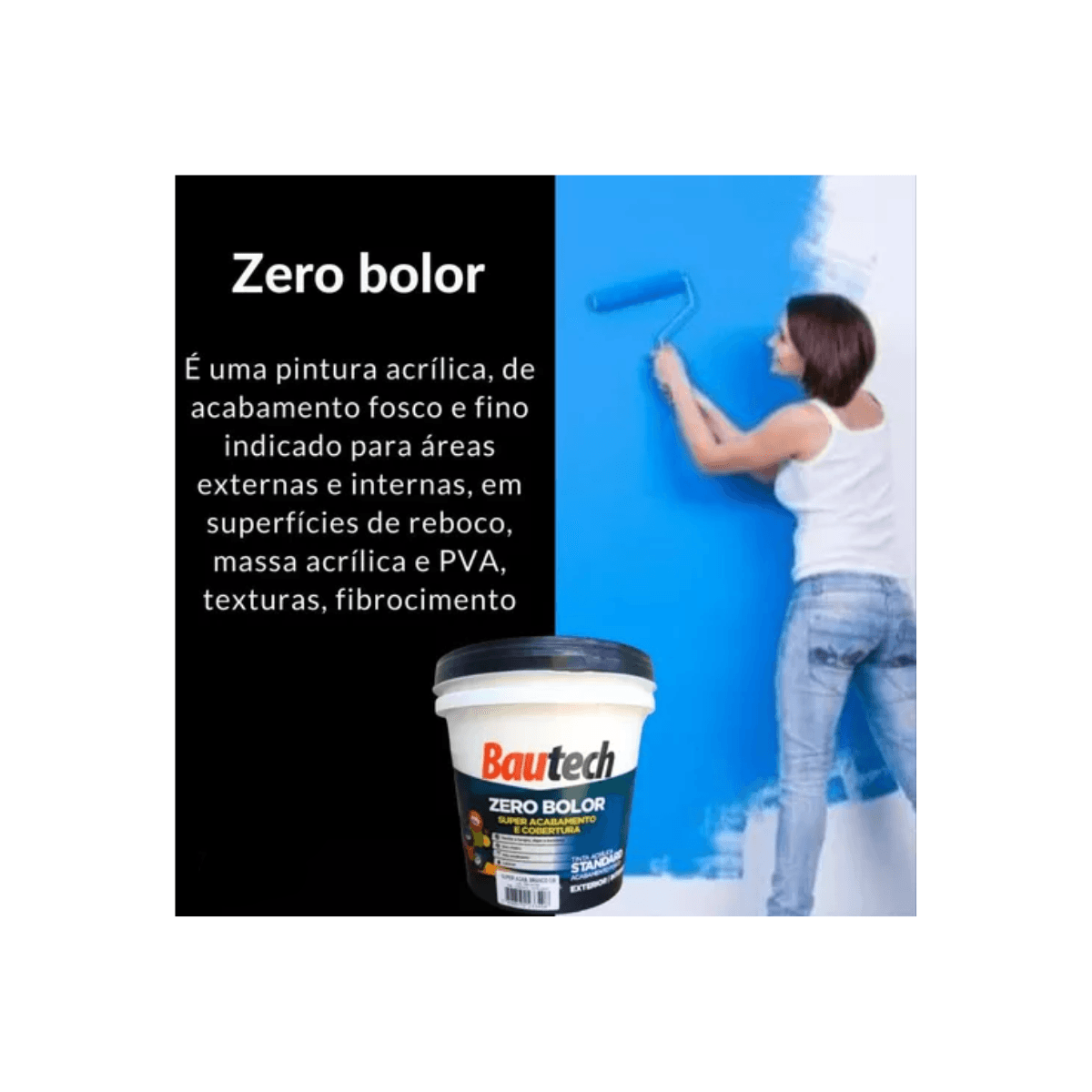 A TINTA BAUTECH ZERO BOLOR é uma pintura acrílica de acabamento fino e fosco indicado para áreas externas e internas em superfícies de reboco, massa acrílica, massa corrida, texturas, grafiatos, concreto, fibrocimento e gesso.Aditivada com agentes fungicidas e algicidas, que impedem a formação de fungos e algas na sua parede.